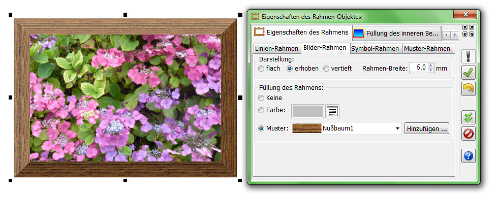 Bei dem Bilder-Rahmen erreicht man mit den Muster-Füllungen in der Regel die interessantesten Effekte. Die Füllung des inneren Bereiches kann auch ein Bild sein. Auf Wunsch passt sich die Größe des Rahmens an die Größe des Bildes an.