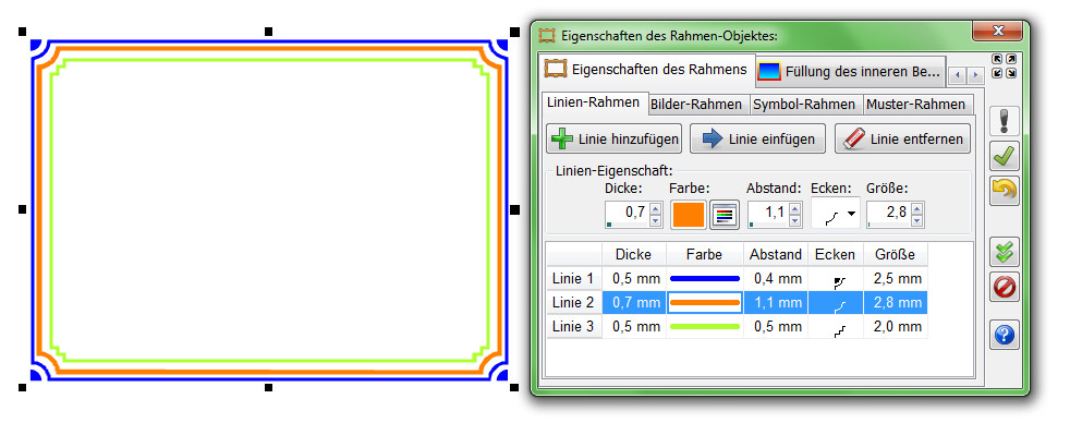 Ein Linien-Rahmen kann aus mehreren, unterschiedlich breiten und farbigen Linien bestehen. Bei jeder Linie kann zusätzlich ein Abstand zur nächsten, inneren Linie angegeben werden. Ebenfalls können unterschiedliche Ecken ausgewählt werden. Durch die Kombination von Linien mit unterschiedlicher Ecken ergeben sich interessante Effekte.