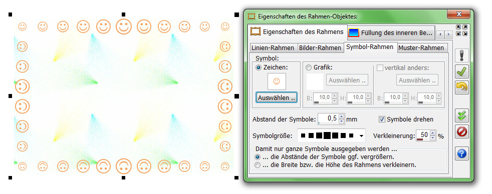 Beim Symbol-Rahmen wird der Rahmen aus der Wiederholung eines Symbols (entweder ein Zeichen aus einem Symbol-Zeichensatz oder aus einer kleinen WMF- oder EMF-Grafik) erzeugt. Durch eine Reihe von Einstellmöglichkeiten lassen sich auch damit interessante Rahmen erzeugen.
