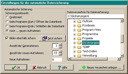 Es besteht die Möglichkeit, direkt vom Programm aus die aktuelle Datenbank sowie die eingestellten Optionen zu sichern bzw. falls notwendig auch zurückzuspielen (wiederherzustellen). Diese Datensicherung kann entweder in ein ausgewähltes Datenverzeichnis oder auf ein externes Medium z.B. einem USB-Stick erfolgen, wobei die Daten - falls gewünscht - komprimiert werden. Für „vergessliche" Anwender gibt es auch die Möglichkeit eine „automatische Sicherung" zu aktivieren. Diese automatische Sicherung speichert die Datensicherungen in einem vorgegebenen Dateiverzeichnis in einem Mehrgenerationen-Prinzip ab. Dabei kann die Anzahl der Generationen zwischen 1 und 9 frei gewählt werden.